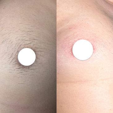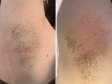 My clients first armpit treatment. The hairs are a little longer on right picture since we waited a week before beginning treatment due to the test patch that was done, to see how it would feel for her and how her skin would react. Before picture (left) After picture (right) Slight rednes